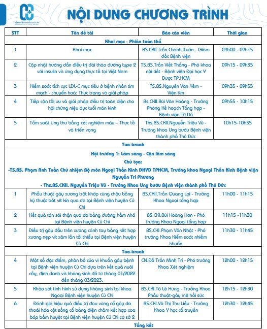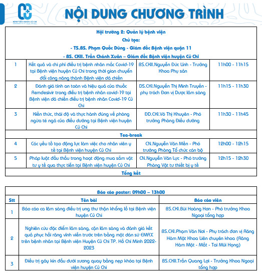 Hội nghị được tổ chức ngày 15 tháng 09 tại hội trường bệnh viện với 1 phiên toàn thể và 2 phiên chuyên môn (Lâm sàng và Quản lý bệnh viện), tổng cộng 15 bài báo cáo oral và 03 bài báo cáo poster với sự tham dự của 300 khách mời. Đây hứa hẹn là một buổi thảo luận khoa học nghiêm túc và chuyên nghiệp.