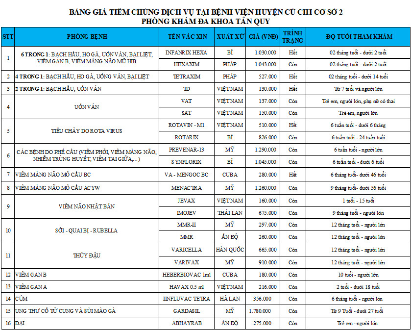 Danh mục vắc xin được sử dụng tại Bệnh viện huyện Củ Chi cơ sở 2 – Phòng khám Đa khoa Tân Quy