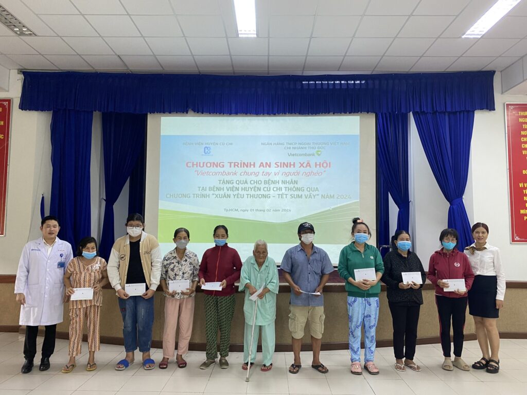 Hòa chung không khí cả nước đang đón chào năm mới, chiều ngày 01 tháng 02 năm 2024 Tổ Công tác xã hội tại Bệnh viện huyện Củ chi đã phối hợp với ngân hàng TMCP Ngoại Thương Việt Nam (Vietcombank) tổ chức chương trình “Xuân yêu thương – Tết sum vầy” với mong muốn chia sẻ khó khăn, thể hiện sự quan tâm đến bệnh nhân có hoàn cảnh khó khăn đang điều trị tại bệnh viện.