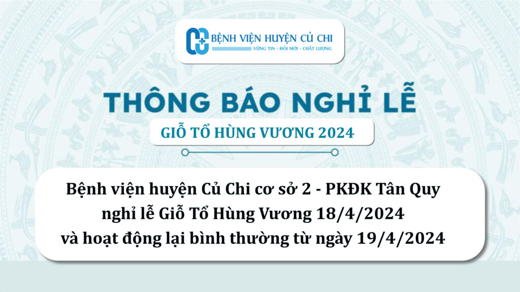 THÔNG BÁO NGHỈ LỄ GIỖ TỔ HÙNG VƯƠNG (10/03 AL) 📅 16/04/2024 ✍️ Tú Tú Bệnh viện huyện Củ Chi cơ sở 2 – Phòng khám Đa khoa Tân Quy xin thông báo lịch nghỉ lễ Giỗ tổ Hùng Vương (10/03 AL) như sau: Thời gian nghỉ Lễ: ngày 18/04/2024 (thứ Năm) Phòng khám hoạt động trở lại bình thường vào ngày 19/04/2024 (thứ Sáu). —————– Bệnh viện huyện Củ Chi cơ sở 2 – Phòng Khám Đa khoa Tân Quy Số điện thoại: 086 906 7279 Địa chỉ: 1312 Tỉnh Lộ 8, xã Tân Thạnh Đông, huyện Củ Chi, TP. Hồ Chí Minh