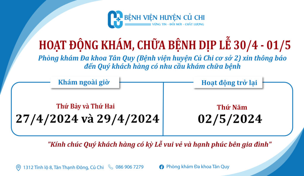 THÔNG BÁO LỊCH NGHỈ LỄ 30/4 – 01/5 📅 26/04/2024 ✍️ Tú Tú Phòng khám Đa khoa Tân Quy (Bệnh viện huyện Củ Chi cơ sở 2) xin thông báo đến Qúy khách hàng có nhu cầu khám chữa bệnh: Trong thời gian nghỉ Lễ: Phòng khám tổ chức khám bệnh ngoài giờ vào Thứ 7 (ngày 27/4/2024) và Thứ 2 (ngày 29/4/2024). Thời gian nghỉ Lễ: ngày 30/4/2024 và 01/5/2024. Phòng khám hoạt động trở lại bình thường vào ngày 02/5/2024 (Thứ Năm). Kính chúc Quý khách hàng có kỳ Lễ vui vẻ và hạnh phúc bên gia đình! ———— Phòng khám Đa khoa Tân Quy (Bệnh viện huyện Củ Chi cơ sở 2) Số điện thoại: 086 906 7279 Địa chỉ: 1312 Tỉnh Lộ 8, xã Tân Thạnh Đông, huyện Củ Chi, TP. Hồ Chí Minh