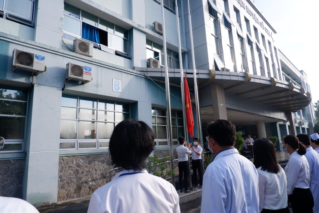 Sáng 31/5/2022 Bệnh viện huyện Củ Chi tổ chức chào cờ tuần đầu tiên kể từ khi bệnh viện chuyển đổi công năng điều trị COVID-19 đến hiện tại. Với mục tiêu xây dựng ý thức và trách nhiệm của cán bộ, công chức và người lao động đối với Tổ quốc, đưa nghi thức chào cờ vào nề nếp, thường xuyên, Bệnh viện huyện Củ Chi tổ chức duy trì thực hiện Lễ chào cờ, hát quốc ca vào buổi sáng thứ hai hàng tuần tại sảnh bệnh viện.