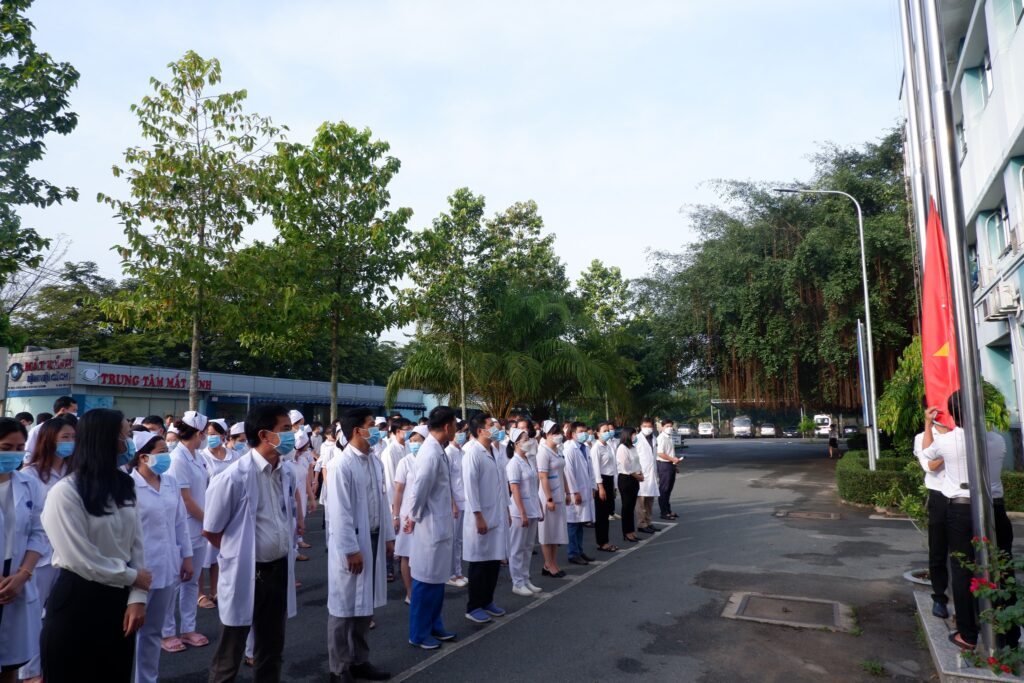 Sáng 31/5/2022 Bệnh viện huyện Củ Chi tổ chức chào cờ tuần đầu tiên kể từ khi bệnh viện chuyển đổi công năng điều trị COVID-19 đến hiện tại. Với mục tiêu xây dựng ý thức và trách nhiệm của cán bộ, công chức và người lao động đối với Tổ quốc, đưa nghi thức chào cờ vào nề nếp, thường xuyên, Bệnh viện huyện Củ Chi tổ chức duy trì thực hiện Lễ chào cờ, hát quốc ca vào buổi sáng thứ hai hàng tu tại sảnh bệnh viện.học hỏi được những bài học quý giá về y đức cũng như tình người, tình yêu quê hương, đất nước.