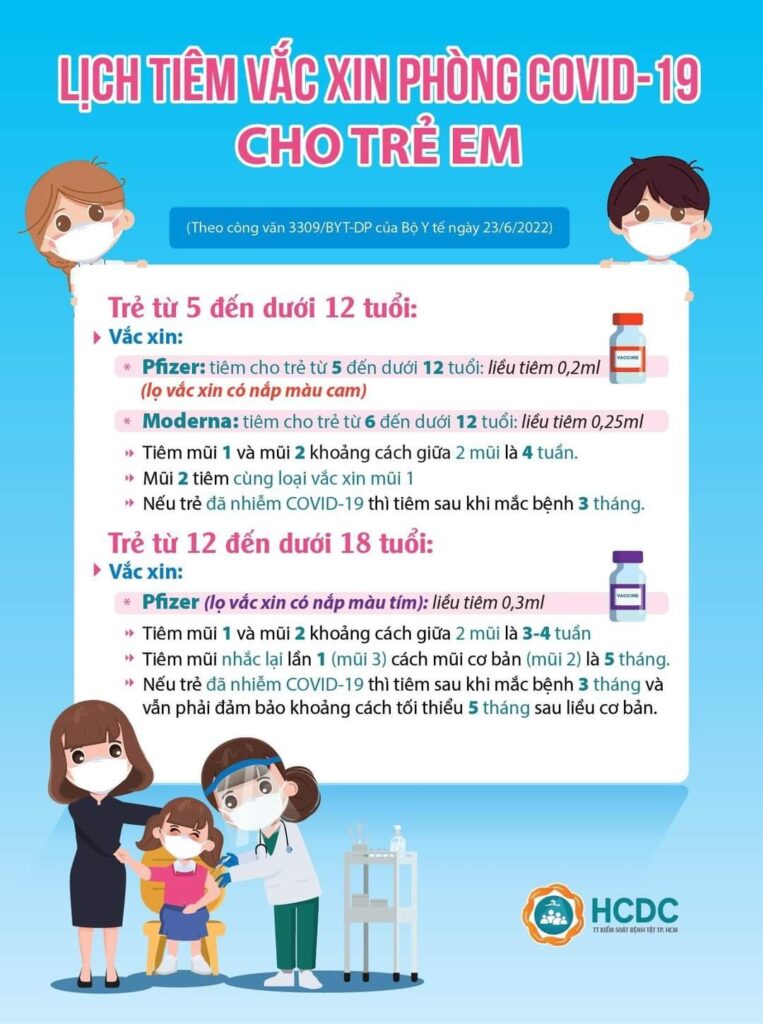 ? Lịch tiêm vắc-xin phòng COVID-19 cho trẻ em ?Tình hình dịch bệnh COVID-19 trên địa bàn Thành phố đang gia tăng trở lại, các bậc phụ huynh hãy đưa trẻ từ 5 đến dưới 18 tuổi đi tiêm vắc-xin phòng COVID-19 (mũi 1 và mũi 2) nếu chưa tiêm. Đối với trẻ từ 12 đến dưới 18 tuổi, hãy tiêm mũi nhắc lại. Tiêm vắc-xin là giải pháp hiệu quả nhất để bảo vệ trẻ. Nguồn: HCDC #benhvienhuyencuchi —————————————– Mọi thắc mắc xin vui lòng liên hệ Bệnh viện huyện Củ Chi Địa chỉ: 1307 tỉnh lộ 7, ấp Chợ Cũ, xã An Nhơn Tây, huyện Củ Chi Số điện thoại: (84-28)37.946.443 nhấn phím 202. Email: bv.cuchi@tphcm.gov.vn